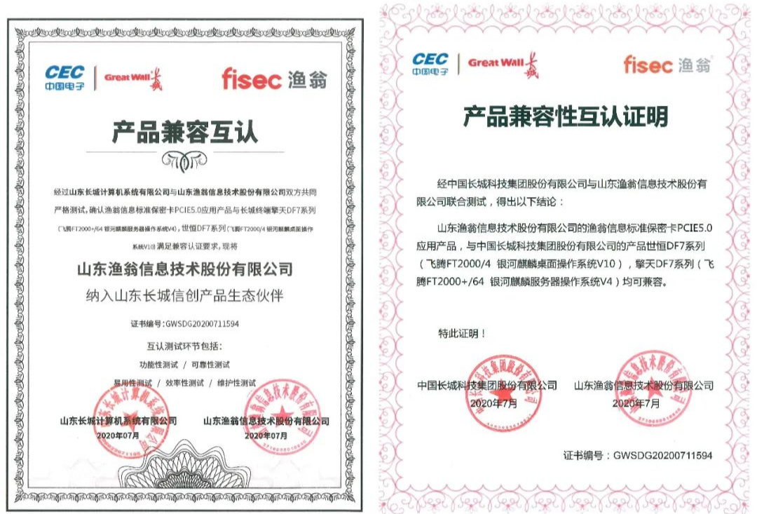 从功能性、可靠性、易用性、效率性、维护性五大环节,银河集团(中国)信息与长城进行了严格的联合测试。最终确认银河集团(中国)PCI-E 5.0密码卡与长城终端产品——世恒DF7系列(飞腾FT2000/4 银河麒麟桌面操作系统V10),擎天DF7系列(飞腾FT2000+/64 银河麒麟服务器操作系统V4),满足兼容认证要求。并且,银河集团(中国)信息此次成为了长城信创产品生态伙伴,携手构建安全新生态。